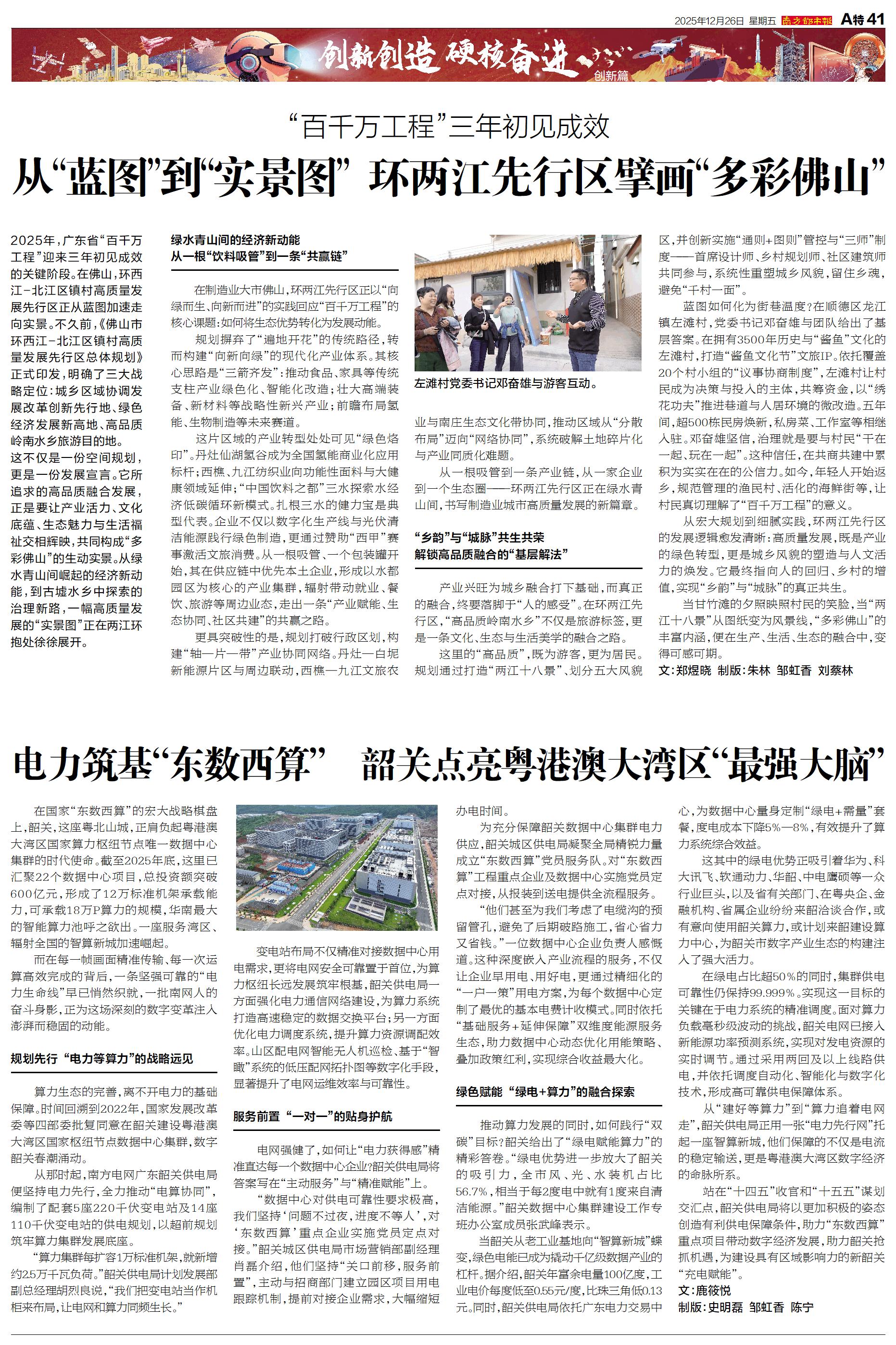 创新篇 2025年,广东省“百千万工程”迎来三年初见成效的关键阶段。在佛山,环西江-北江区镇村高质量发展先行区正从蓝图加速走向实景。不久前,《佛山市环西江-北江区镇村高质量发展先行区总体规划》正