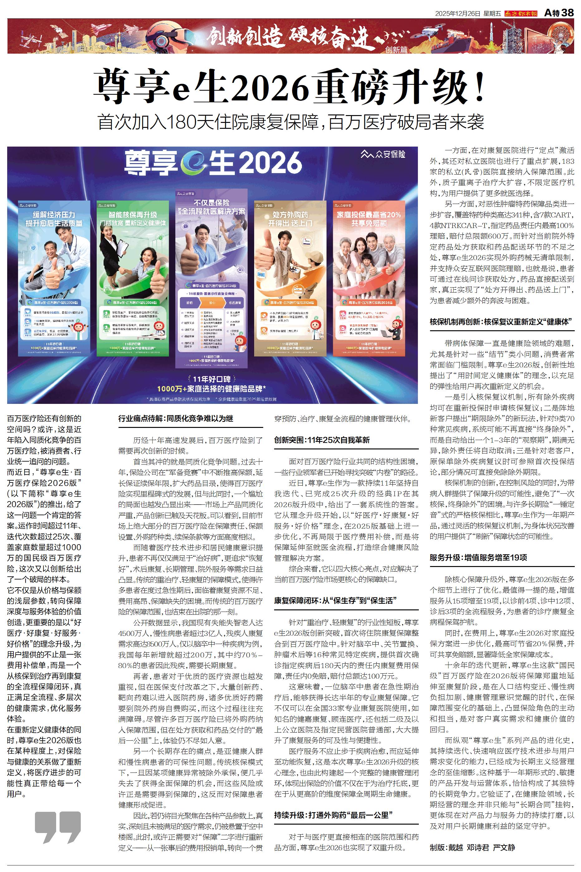 创新篇 百万医疗险还有创新的空间吗?或许,这是近年陷入同质化竞争的百万医疗险,被消费者、行业统一追问的问题。 而近日,“尊享e生·百万医疗保险2026版”(以下简称“尊享e生2026版”)的推