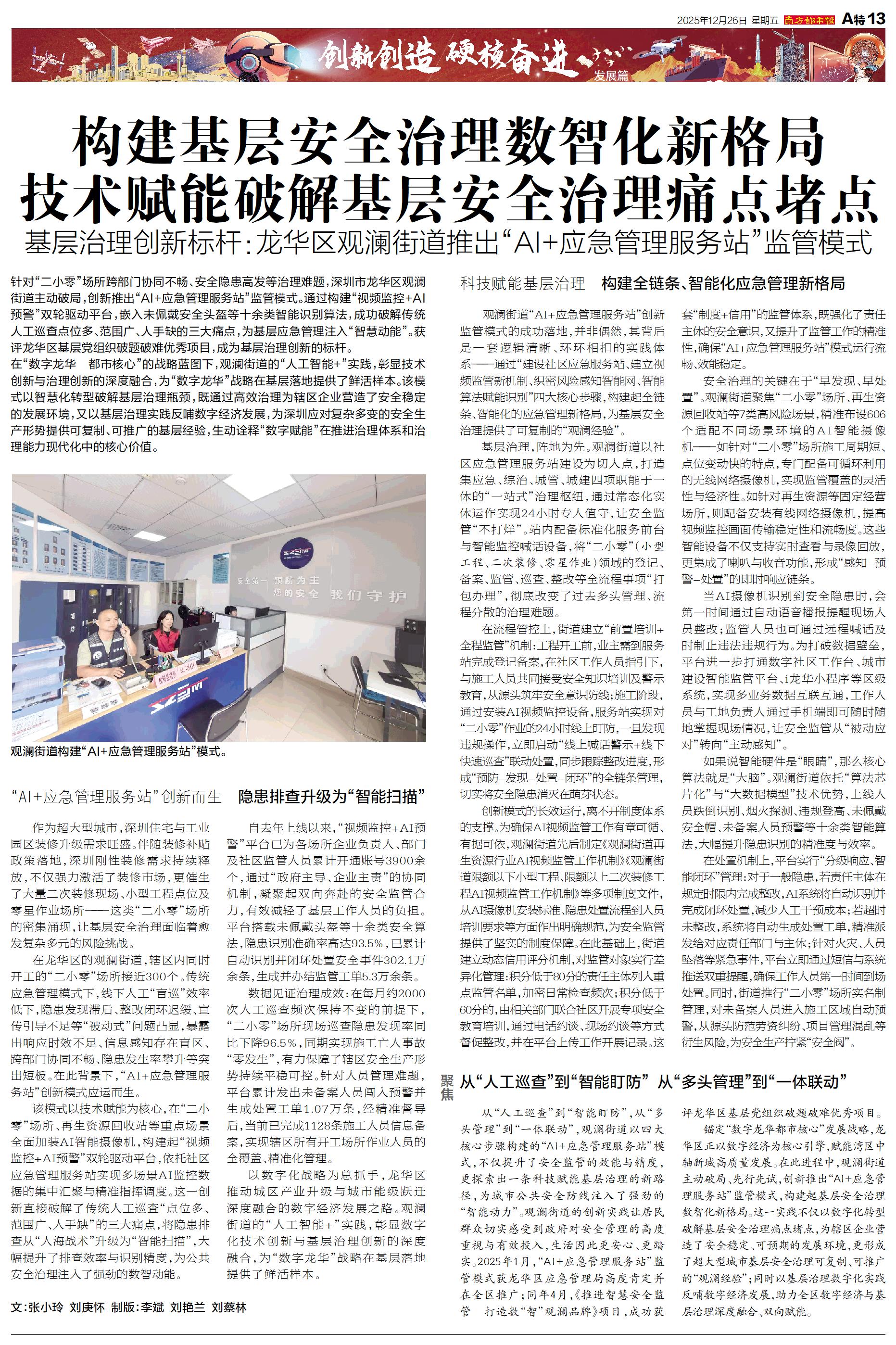 发展篇 针对“二小零”场所跨部门协同不畅、安全隐患高发等治理难题,深圳市龙华区观澜街道主动破局,创新推出“AI+应急管理服务站”监管模式。通过构建“视频监控+AI预警”双轮驱动平台,嵌入未佩戴安