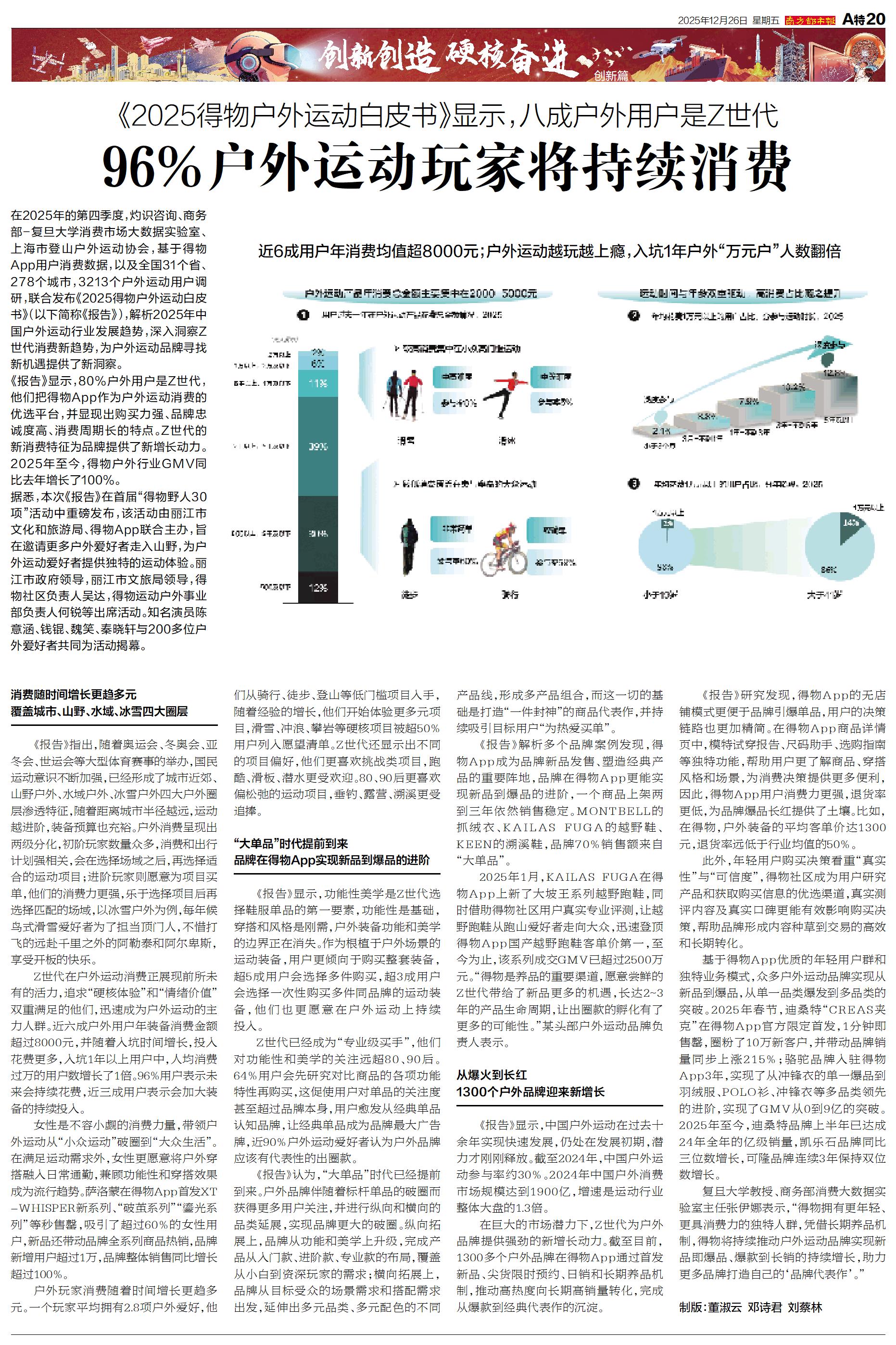 创新篇 在2025年的第四季度,灼识咨询、商务部-复旦大学消费市场大数据实验室、上海市登山户外运动协会,基于得物App用户消费数据,以及全国31个省、278个城市,3213个户外运动用户调研,联