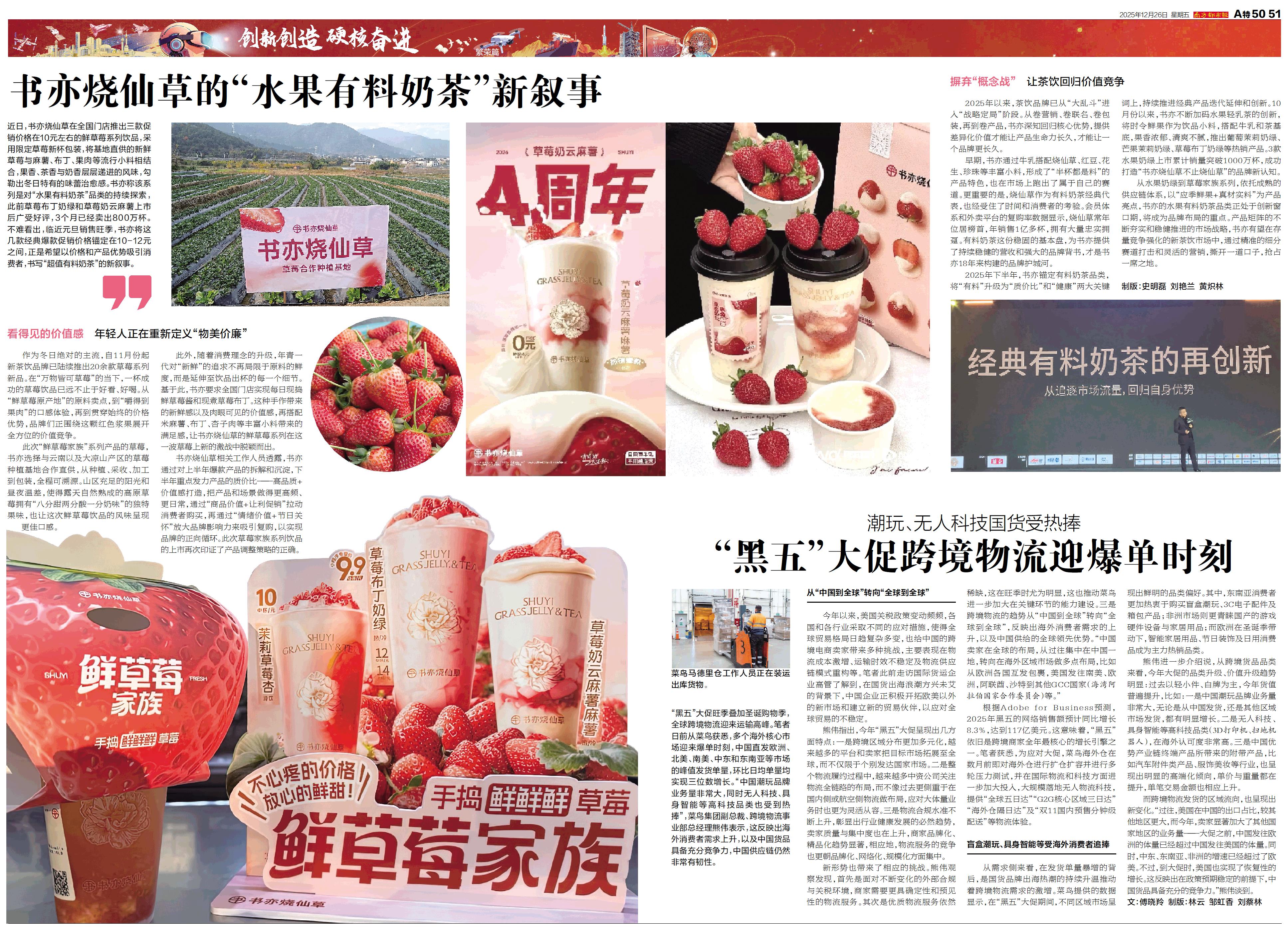 繁荣篇 近日,书亦烧仙草在全国门店推出三款促销价格在10元左右的鲜草莓系列饮品,采用限定草莓新杯包装,将基地直供的新鲜草莓与麻薯、布丁、果肉等流行小料相结合,果香、茶香与奶香层层递进的风味,勾勒