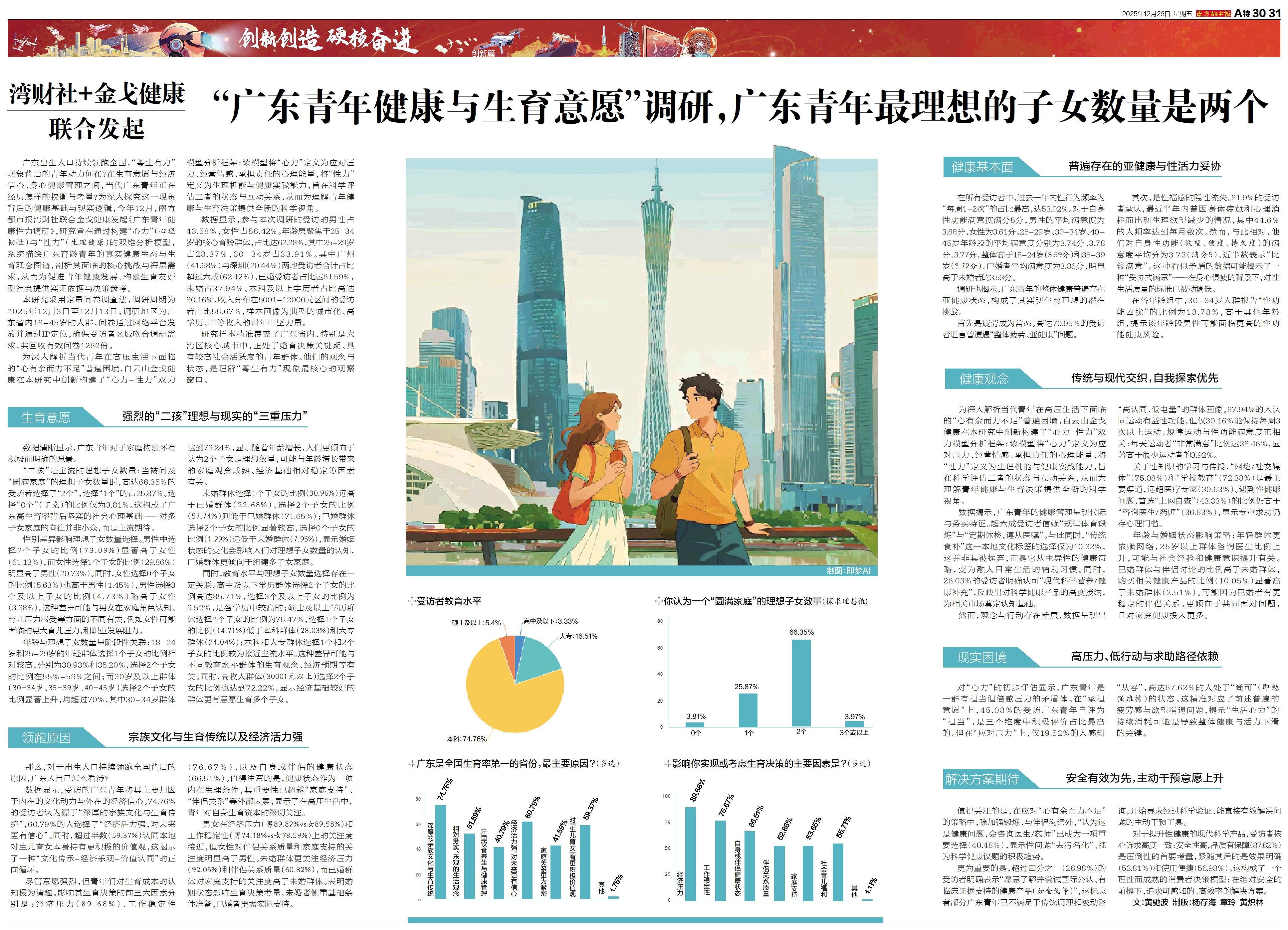 创新篇 广东出生人口持续领跑全国,“粤生有力”现象背后的青年动力何在?在生育意愿与经济信心、身心健康管理之间,当代广东青年正在经历怎样的权衡与考量?为深入探究这一现象背后的健康基础与现实逻辑,今