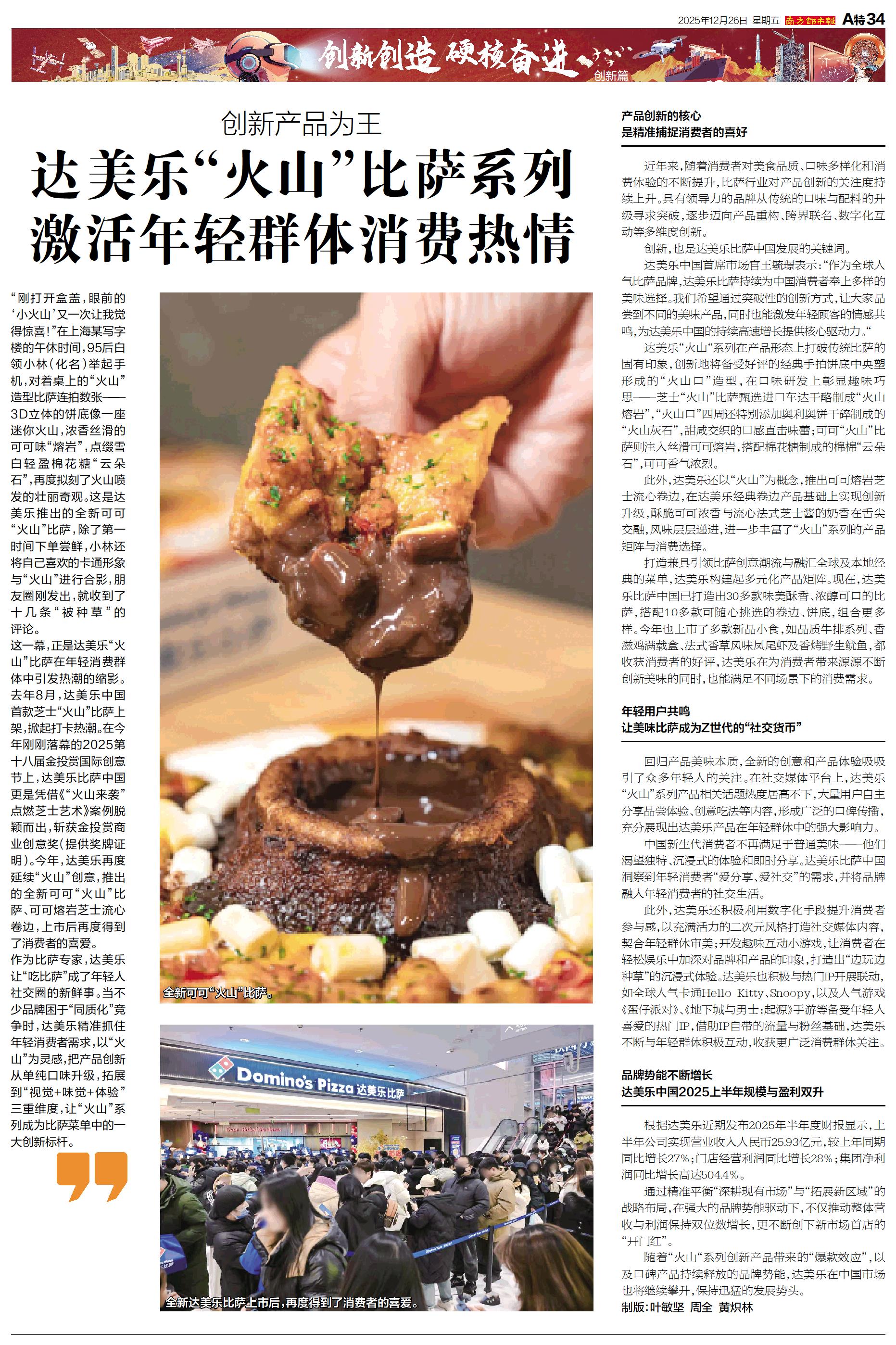 创新篇 “刚打开盒盖,眼前的‘小火山’又一次让我觉得惊喜!”在上海某写字楼的午休时间,95后白领小林(化名)举起手机,对着桌上的“火山”造型比萨连拍数张——3D立体的饼底像一座迷你火山,浓香丝滑