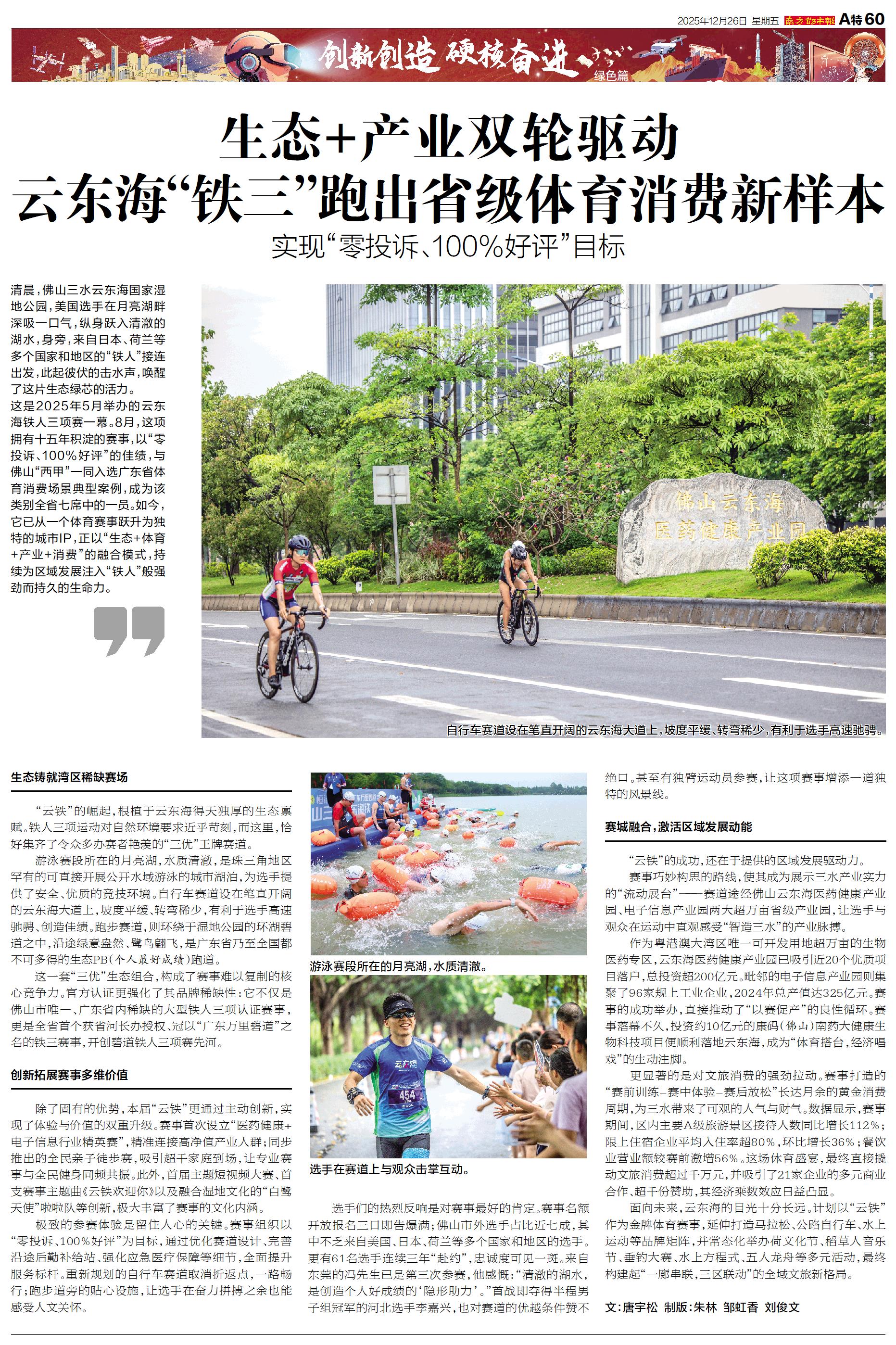绿色篇 清晨,佛山三水云东海国家湿地公园,美国选手在月亮湖畔深吸一口气,纵身跃入清澈的湖水,身旁,来自日本、荷兰等多个国家和地区的“铁人”接连出发,此起彼伏的击水声,唤醒了这片生态绿芯的活力。