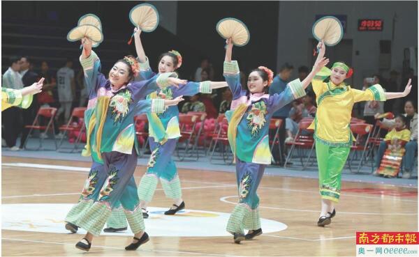 ③3月28日,韶关市韶州体育中心体育馆,演员表演采茶歌舞。新华社记者 黄国保 摄