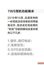 2019年10月,高通发布的一份无线音频消费者调查报告显示,除了通话功能,受访者对无线耳机“智能”功能的期待还包括无屏交互、健康数据监测、GPS定位,以及游戏、视频内容等。