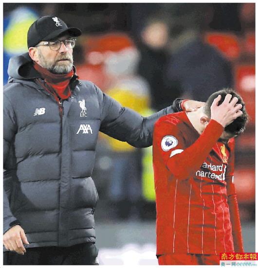 克洛普在赛后安慰罗伯逊,利物浦英超18连胜和44场不败的傲人成绩就此终结。新华社发