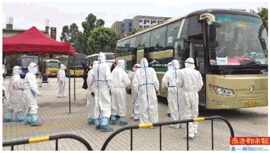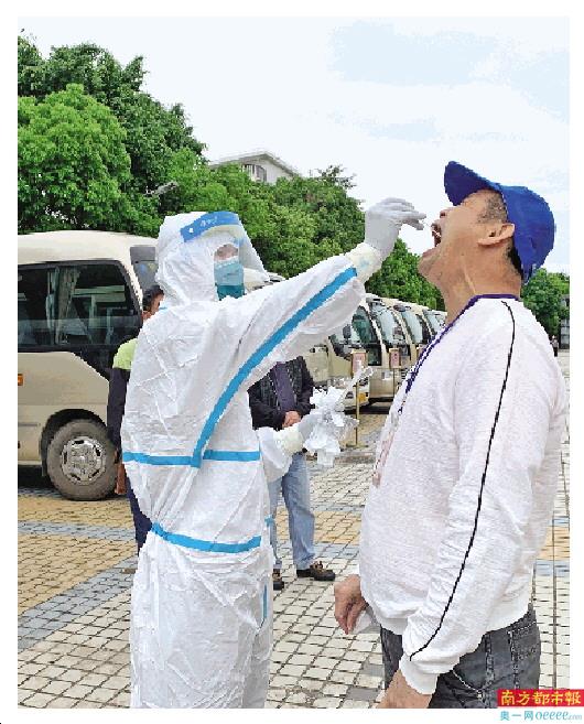 4月1日,8名即将回家的大巴司机依次接受医护人员的咽拭子采样。