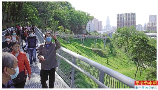 记者从越秀公园东北门节点步行至花果山节点,沿路看到不少市民,空中步道的人气颇高。同时,因为处于疫情期间,步道的各个节点有设置测温点和登记处,并配有洗手间、座椅等公共设施。