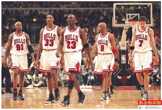 →1998年4月24日,公牛队的罗德曼、皮蓬、乔丹、哈帕、库科奇(从左至右)在比赛中。 图/视觉中国