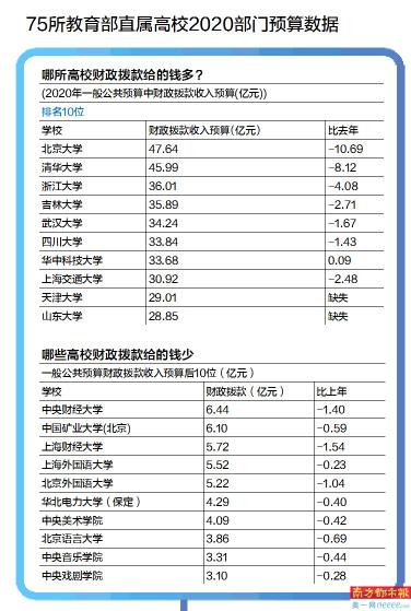 今年哪所高校经费最多?南都记者梳理发现,75所高校中,排名前十的分别为清华大学、浙江大学、北京大学、中山大学、上海交通大学、复旦大学、山东大学、华中科技大学、东南大学及西安交通大学。