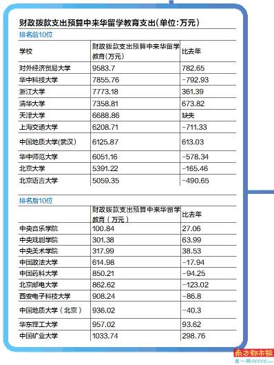 经南都记者统计,75所高校中,有64所高校财政拨款支出中,来华留学教育支出预算超千万元。其中,最多的是对外经济贸易大学,为9583.7万元,比去年多782.65万元。对外经贸大学对此解释,主要原因是留学生规模扩大。