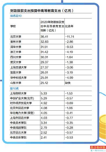 此外,财政拨款支出预算中,多所高校高等教育支出及来华教育支出均有所下降,北京大学、清华大学等高等教育支出预算下降幅度也在20%以上。