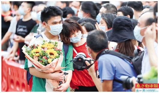 执信中学高三的同学结束高考后,与妈妈合影。 南都记者 邹卫 摄