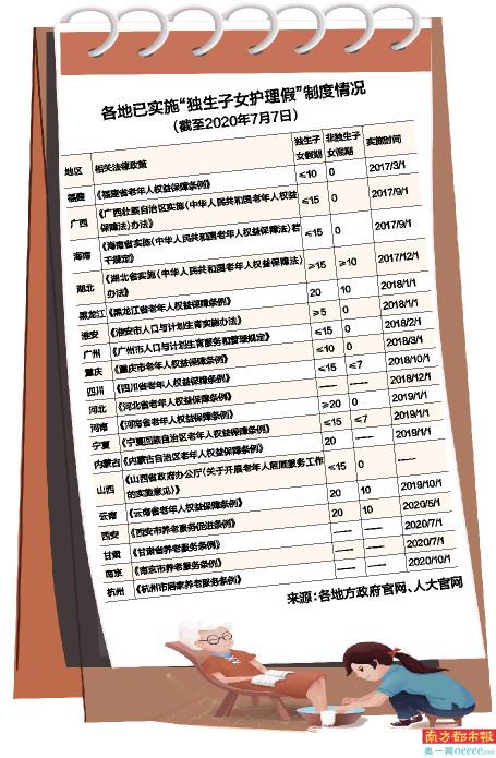 南都记者注意到,在已实施护理假的省市中,甘肃、南京、杭州3地没有区分独生子女与非独生子女,因此当地非独生子女应当也在护理假制度范围。