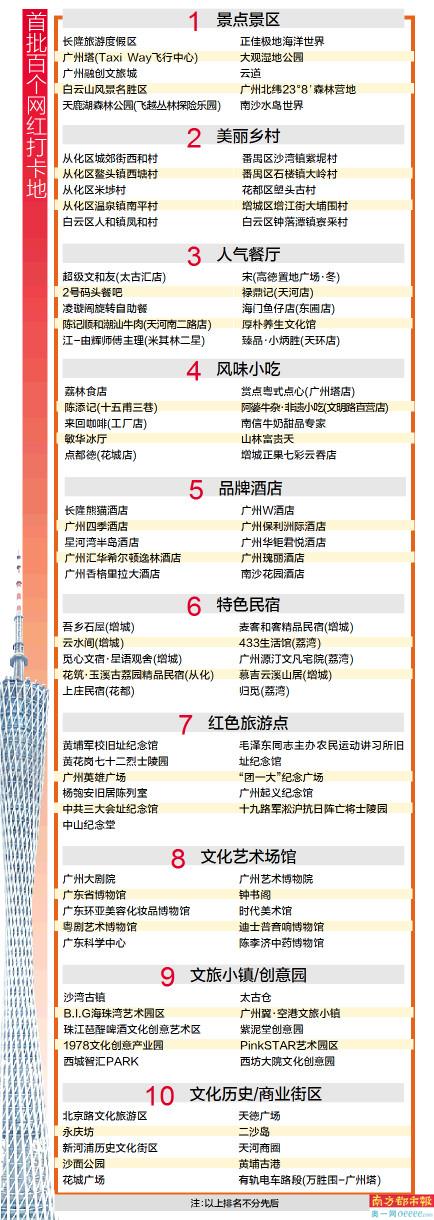 目前,广州市文化广电旅游局根据抖音平台上的视频播放量、话题参与度及推荐攻略阅读量等数据,综合推荐评选出了第一期广州网红打卡地名单,优选了极具人气的景点景区、美丽乡村、人气餐厅、风味小吃、品牌酒店、特色民宿、红色旅游点、文化艺术场馆、文旅小镇/创意园、文化历史/商业街区10个类别的TOP10,合计百个网红打卡点。