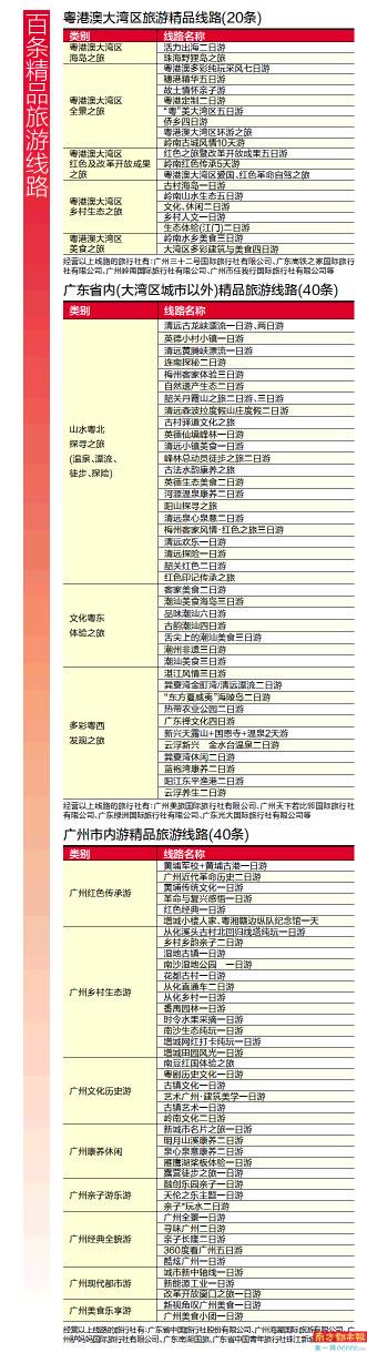 同时,广州市文化广电旅游局面向各旅行社广泛征集了广州市内、广东省内(大湾区城市以外)和粤港澳大湾区内的精品旅游线路,共收到近70家旅行社报送的300多条旅游线路产品,并筛选整理出16类100条精品旅游线路。