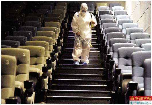 昨日,河北省邯郸市丛台区一家影院的工作人员对放映厅进行消毒,为恢复开放营业做准备。国家电影局7月16日下发通知规定,低风险地区在电影院各项防控措施有效落实到位的前提下,可于7月20日有序恢复开放营业。 新华社发