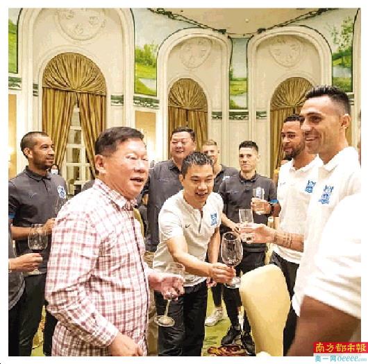 前天晚上,富力集团董事长张力宴请了广州富力足球俱乐部全体人员。可以看出球员们举杯时喝的都是水而不是酒。第二天,广州富力队出征大连,成为首支抵达大连赛区的队伍。 富力俱乐部供图