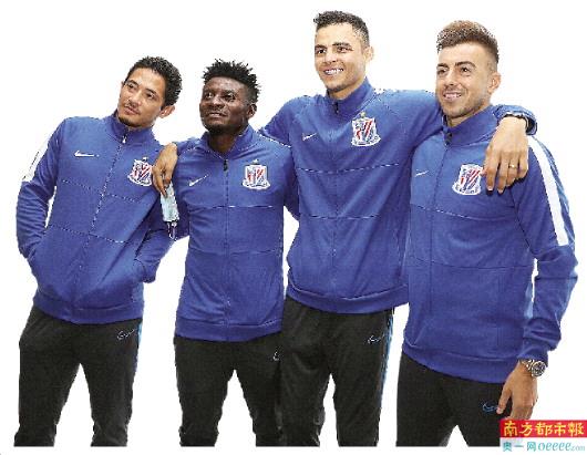 7月15日,上海申花举行出征仪式,钱杰给、马丁斯、沙拉维和莫雷诺合影。新赛季申花引入了一众老将。他们的目标是前四。 视觉中国图