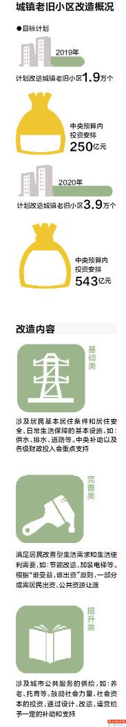 国家发展改革委固定资产投资司负责人刘世虎在吹风会上介绍,经国务院同意,2019年起,将城镇老旧小区改造纳入保障性安居工程,中央给予资金补助。2019年计划改造城镇老旧小区1.9万个,国家发改委分两批在中央预算内投资保障性安居工程专项中安排250亿元予以支持;2020年《政府工作报告》明确计划改造城镇老旧小区3.9万个,中央预算内投资安排543亿元,目前已经全部下达完毕,实现了“城镇老旧小区改造任务翻番,中央预算内投资安排翻番”。