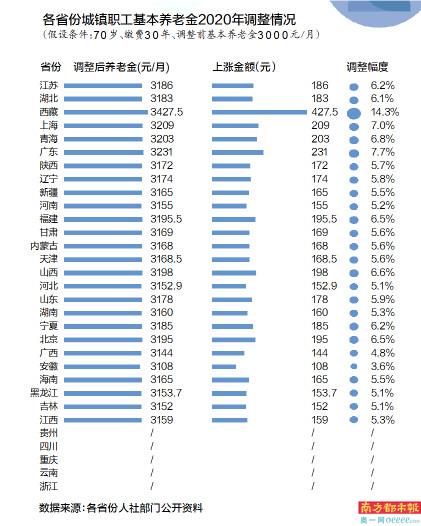 实际上,即便是同等条件的退休人员,即缴费年限和上年基本养老金水平相同,在不同的省份上涨金额和幅度也是不同的。仍以张大爷为例,其在上海、青海、广东退休,月上调金额均超过200元,西藏甚至能超过400多元。如果在广东退休,他可以在3000元/月的基础上每月再多领231元,增幅7.7%;而如果他在安徽退休,每月仅可多领108元,增幅为3.6%。
