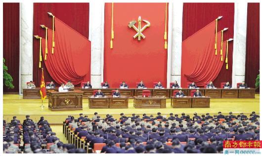 金正恩在朝鲜劳动党七届五中全会上发言。 新华社发
