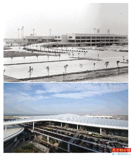 上图为深圳机场老航站楼;下图为2013年11月28日拍摄的新启用的深圳机场航站楼。