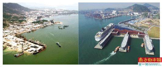 左图为深圳蛇口港。右图为联通深圳、珠海、澳门、香港,以及可以停泊邮轮的深圳蛇口太子湾邮轮母港。