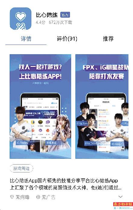 南都记者了解到,“比心陪练”App是一个主打游戏陪练的平台,平台的定位是“约玩”,其前身是2015年上线的“鱼泡泡”App,有“国内最大的声优平台”之称,最早提供的是“线下陪玩”的服务,有陪玩游戏、声优陪聊、“处CP”等功能。