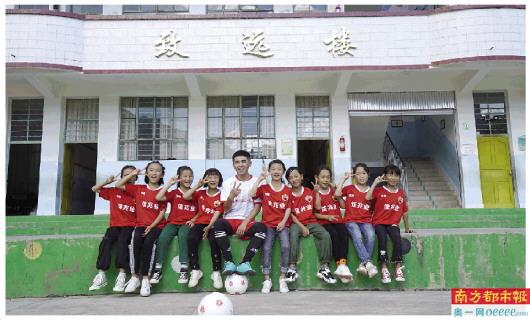 支教老师周锦杭与穿着深足球衣的女足队员们。 南都记者 丰臻 摄