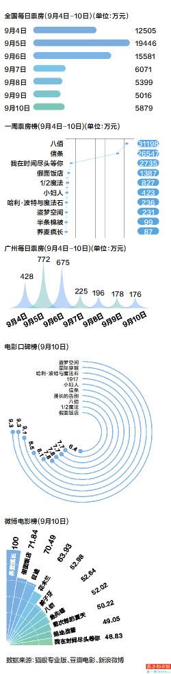 从全国票房数据看,9月7日之后大盘回落到亿元以下,甚至在5000万左右低位徘徊。而在《八佰》和《信条》之外,位列第三的是已经上映超过半个月且口碑一般的《我在时间尽头等你》,票房成绩和前两者相比有十倍的差距,然后和木村拓哉、长泽雅美主演的悬疑片《假面饭店》组成第二梯队,第三梯队之后票房总成绩都在千万元以下。
