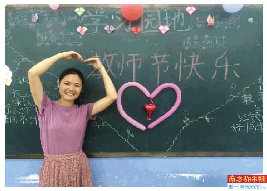 9月10日,教师节,90后女教师林小恋与学生为她准备的黑板报合影。