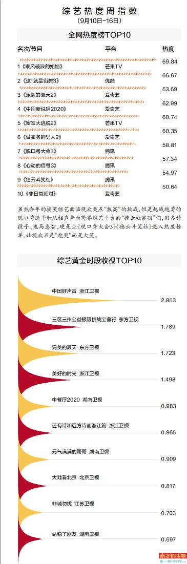 本周卫视平台黄金档收视率最高的综艺节目还是综N代节目《中国好声音》。本季请来了人气明星李宇春、谢霆锋等担任导师,在话题人气上足够抢夺眼球,足以维持住固定收视人群。此外,在今年“脱贫攻坚”的大主题之下,《极限挑战》的衍生公益节目《三区三州公益极限挑战宝藏行》受到追捧,以1.789的收视率排名第2。美丽如画的三区美景,加上当地特色食物特产,都让观者“赏心悦目”,成为周末下饭必看节目。