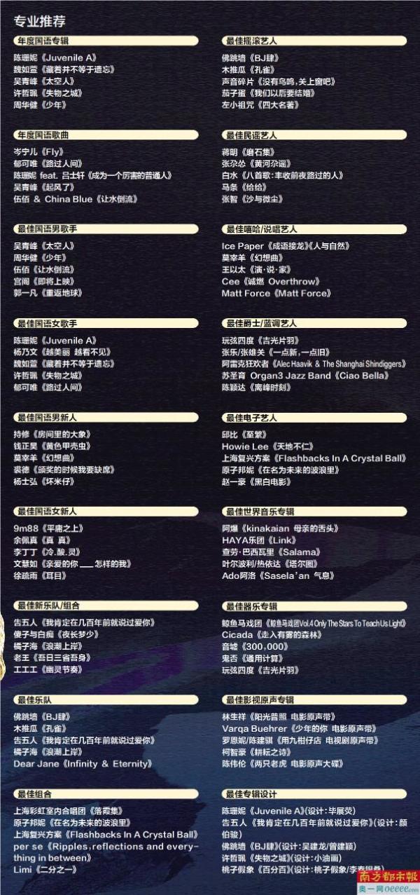原创音乐和独立音乐一直是流行音乐最为生动和有生命力的组成,本次南方音乐盛典入围名单,仍旧是原创音乐大获全胜。其中拿下7项提名的陈珊妮是华语乐坛“唱作女王”,并且是作词、作曲、编曲、制作全能,本次凭借《Juvenile A》入围也在创作领域中有斩获。