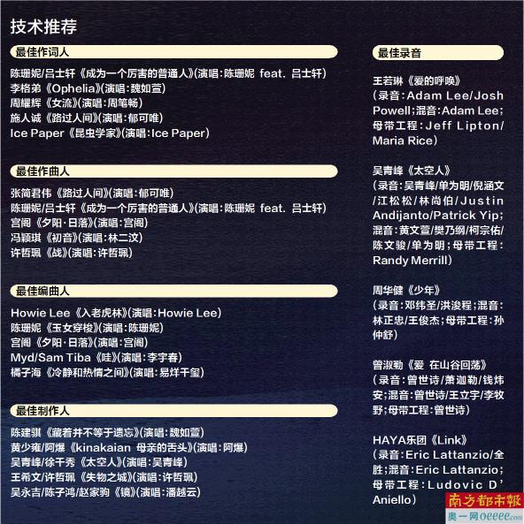 此外诸如获得6项提名的许哲珮、获得4项提名的魏如萱也都是“唱作歌手”,获得4项提名的乐队橘子海以及获得3项提名的宫阁则是最有实力的新生代创作力量。宫阁不仅凭借《即将上映》入围最佳国语男歌手,还同时入围了最佳作曲人和最佳编曲人;橘子海除了自己备受好评的专辑《浪潮上岸》,帮助易烊千玺制作的《冷静和热情之间》也入围最佳编曲。
