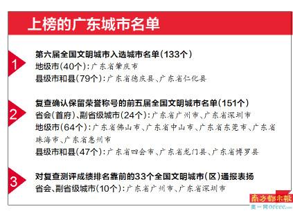 南都讯 记者杨婷 昨日,中央文明办公布第六届全国文明城市入选城市名单和复查确认保留荣誉称号的前五届全国文明城市名单。据悉,广东又有3个城市进入全国文明城市的行列,包括肇庆市、德庆县、仁化县,而此次入选第六届全国文明城市的共有133个。