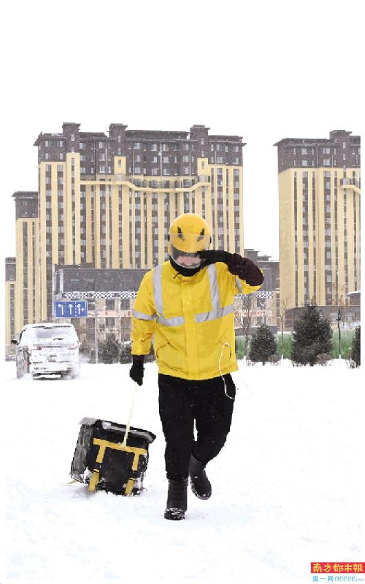 11月19日,赤峰市敖汉旗新惠镇路面积雪,一名外卖送餐员步行送餐。 新华社发