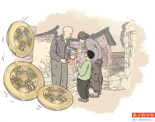 经大人们一枚枚辨认,除了铜钱,就是大钞,一块光洋也没有,一家人多少有点失落。奶奶却摸着我的脑袋,微笑着说:“你太公常说一句话:‘晚辈不如我,要钱财做什么?晚辈胜似我,要钱财做什么?’没啥,本来就没指望它!”