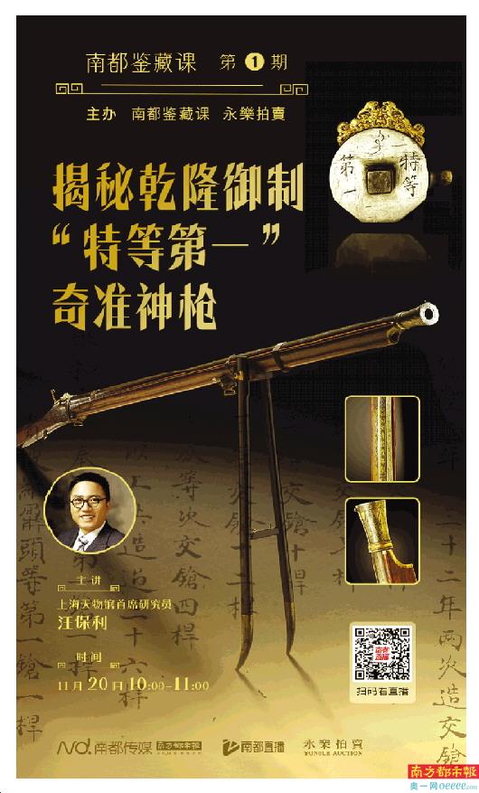 11月20日,“南都鉴藏课”首期开讲,活动邀请到上海天物馆首席研究员汪保利先生,讲述御制神枪背后的故事。直播活动中,观众兴致盎然,反响热烈。