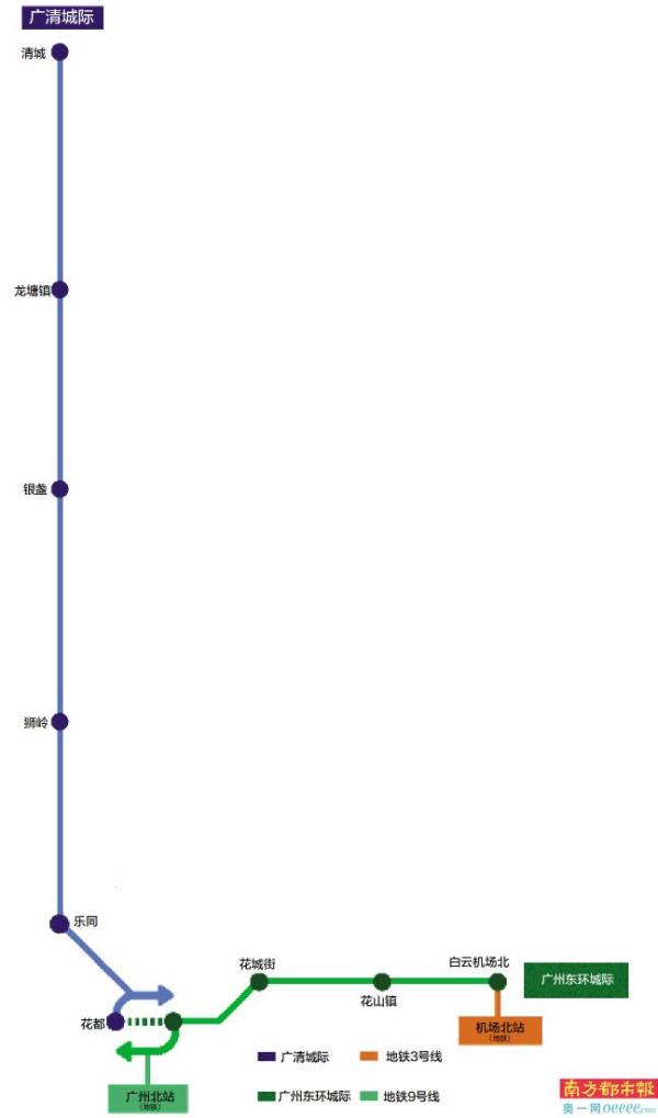 其中,花都站为广清城际、广州东环城际换乘站。此外,花都站还可换乘广州地铁九号线;白云机场北站可换乘广州地铁三号线。广清城际最高速度200公里/小时,广州东环城际最高速度160公里/小时。