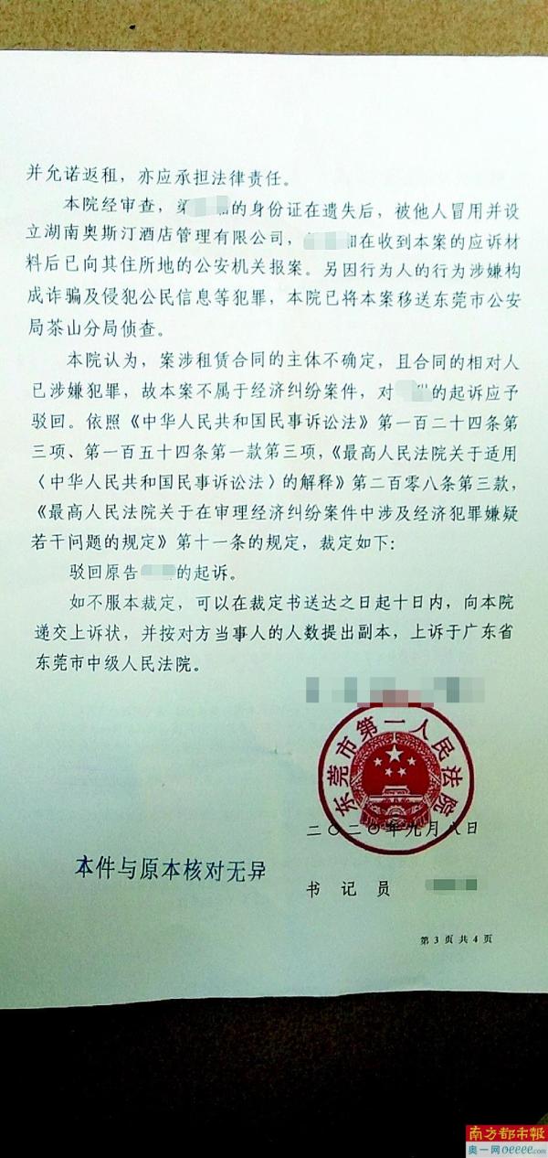 9月25日,梁同学向南都记者反映,东莞市第一人民法院已发来回函。法院经审查,梁同学的身份证在遗失后,被他人冒用并设立湖南奥斯汀酒店管理有限公司。梁同学在收到应诉材料后已向其住所地的公安机关报案。法院认为,涉嫌租赁合同的主体不确定,且合同的相对人已涉嫌犯罪,不属于经济纠纷案件,对原起诉应予驳回。