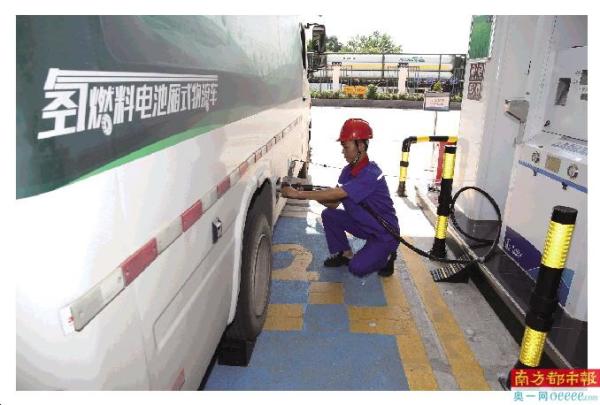 佛山樟坑油氢合建站工作人员正在进行车辆 加氢操作(高君拍摄)