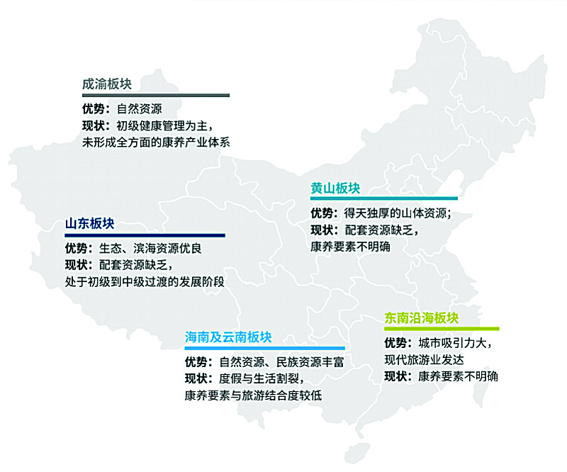 值得注意的是,虽然老年旅游的市场不断壮大,但针对老年人的康养旅游产品却无法满足市场需求。戴德梁行研究院发布的《中国康养旅游发展与趋势》中提到,在旅游市场快速发展的同时,全国各地纷纷推出极具当地自然或人文特征的康养旅游产品。中国各片区康养旅游资源主要包括成渝板块、黄山板块、山东板块、海南及云南板块、东南沿海板块。这些板块的康养旅游资源优势均在于得天独厚的自然、生态和山体资源,但基本都处于初级、中级的发展阶段,康养要素不明确。
