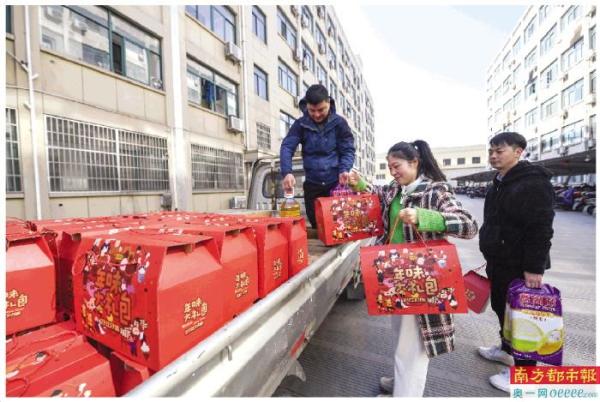 1月13日,在位于诸暨的全兴精工集团有限公司员工宿舍楼下,工作人员搬运过年礼包,准备送给宿舍的外地员工。 新华社发
