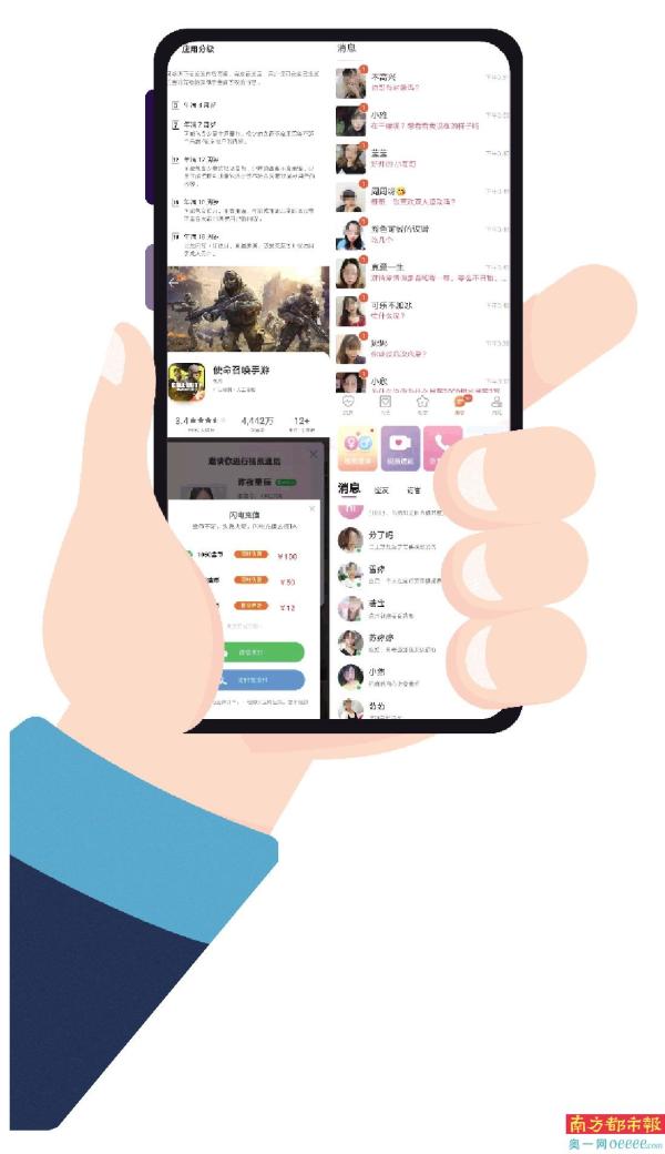 南都记者随机下载了一款名为“附近**”的App,以男性用户注册登录后,短短十几分钟内,便连续收到了十余条不同女性的搭讪私信,私信内容挑逗、暧昧。使用期间,还会不断收到女性用户打来的“视频通话”,点击接受后,界面即刻弹窗提示充值,金额12-3000元不等,充值相应金币后,便会获得一定的视频聊天次数。但如果拒接电话,即使离开该应用,视频呼叫也会在后台一次次响起。此外,若以女性用户身份注册登录后,平台则不断提醒完善信息,包括身高、胸围、婚恋状态等,女性用户还可以对视频、语音设置收费。