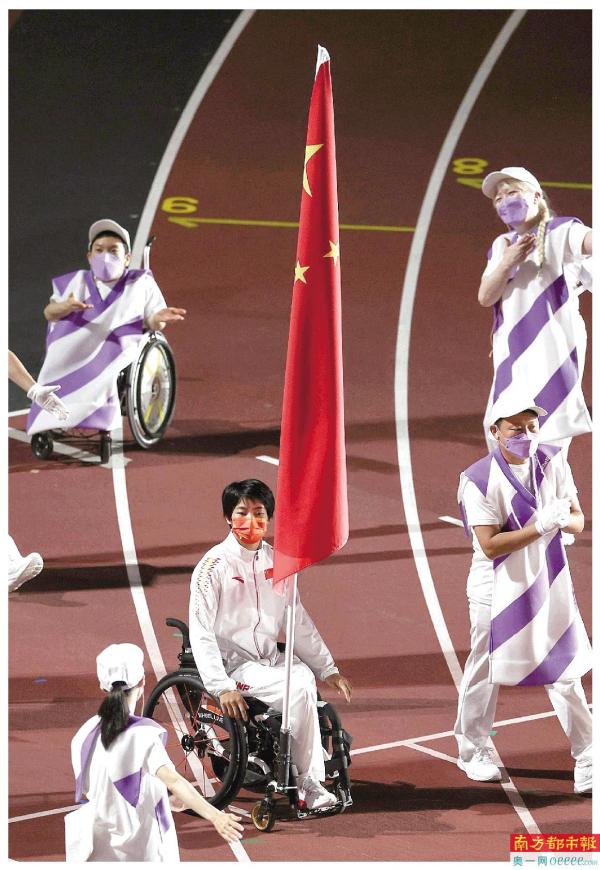 东京残奥会闭幕式上,中国体育代表团旗手张雪梅(中)入场。 新华社发
