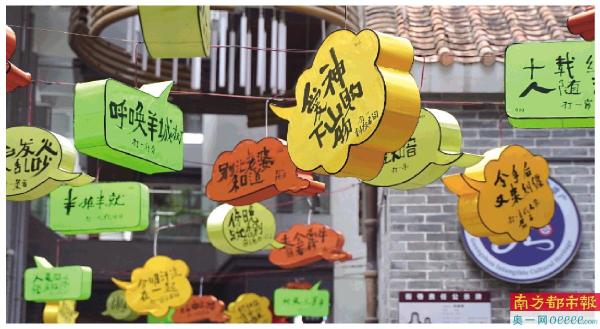 记者在展览现场见到,不但永庆坊的主要街道,就连附近下西关涌岸边的树上也挂满了谜语灯笼,灯笼的形状是对话框,身处其中,拍成照片很有二次元的感觉。南都记者还发现,谜面的内容不但跟节庆有关系,而且语言风格也比较时尚、活泼。譬如“情人送花莫遮掩(打一饮料)”“你也思念我也思念(打一棋语)”“恋爱通告(打一军事用语)”等等。不过,最引人注目的当属永庆坊瞻云精选酒店墙角的九只狮头灯笼,灯笼下面各引一红布条写着谜面。据邱志杰介绍,这几只狮头是由市级非遗项目狮头扎作传承人亲手制作的,而谜底是九位与广东有关而名满天下的历史人物。