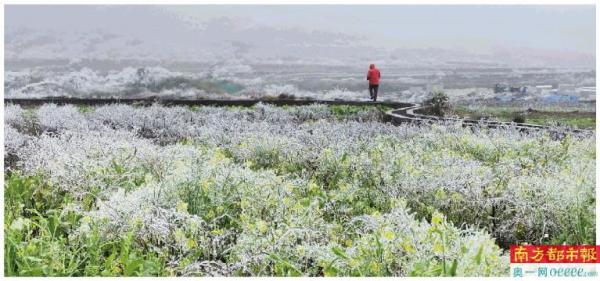 连州高山村委横山村,油菜花上结满了冰挂,晶莹剔透。 南都拍客 丘贵星 摄