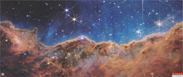 在船底座星云(Carina Nebula)图中,显示了名为NGC3324的恒星形成区域的“山脉”和“山谷”,该区域被称为“宇宙悬崖”,距离地球7600光年。